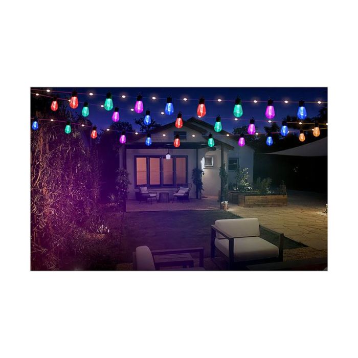 | Caractéristiques complémentaires | 25 ampoules LED RVB IC espacées de 60 cm. Distance entre la prise et la première ampoule : 3m. Longueur totale 17,4m. Alimentation secteur. Niveau d’étanchéité: ampoules IP65, Adaptateur secteur IP44. Contrôle par télécommande, contrôle à distance par wifi via l’application Tuya Smart. Nombreux effets disponibles, luminosité ajustable, Minuteur.Puissance max: 5W. |