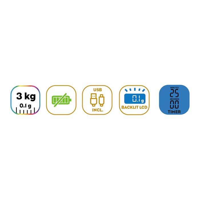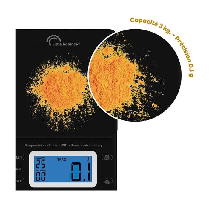 | Caractéristiques complémentaires | - Fonctionne sans pile, par rechargement USB-C (branchement universel) : 3 heures de charge pour 6 mois d'autonomie (500 pesées environ) - Pour cuisiner et pâtisser facilement et très précisément, tous vos ingrédients solides ou liquides - Ultra précise pour tous les petits objets, les lettres et autres petits colis : 0,1 g de 0 à 1 kg / 1 g de 1 à 3 kg - Timer intégré de 99,59 minutes pratique pour suivre toutes vos préparations - Fonction TARE pour peser vos ingrédients successivement sans vider votre récipient - Touches effleurement pour une utilisation agréable et intuitive Design moderne et compact aux finitions noires élégantes, cette balance trouve facilement sa place dans toutes les cuisines. |