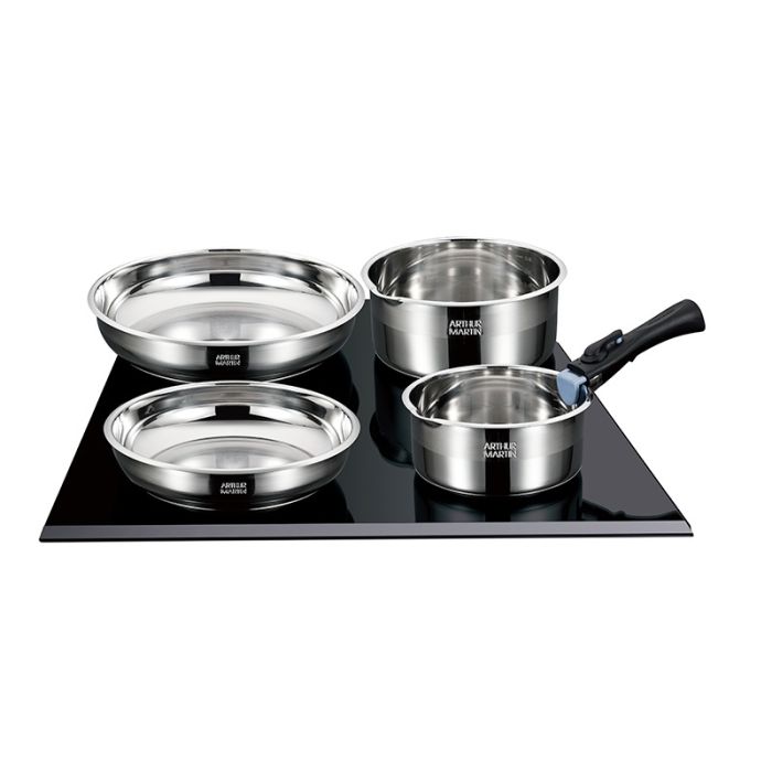 | Caractéristiques complémentaires | Batterie de cuisson ARTHUR MARTIN inox composition 10 pièces :- 3 casseroles 16 18 20 cm- 3 poêles 20 22 26 cm- 2 ustensiles nylon- 2 poignées amoviblesPoêles et casseroles en revêtement intérieur inox satinéCasseroles avec bec verseurFond capsule épais, très bon conducteur pour l'inductionPour conserver longtemps vos poêles : lors de l'utilisation, chauffer avec un peu de matière grasse avant d'ajouter, sur feu doux, vos aliments.Une fois la cuisson terminée, laisser refroidir votre poêle avec un fond d'eau légèrement savonneuse et/ou vinaigrée |
