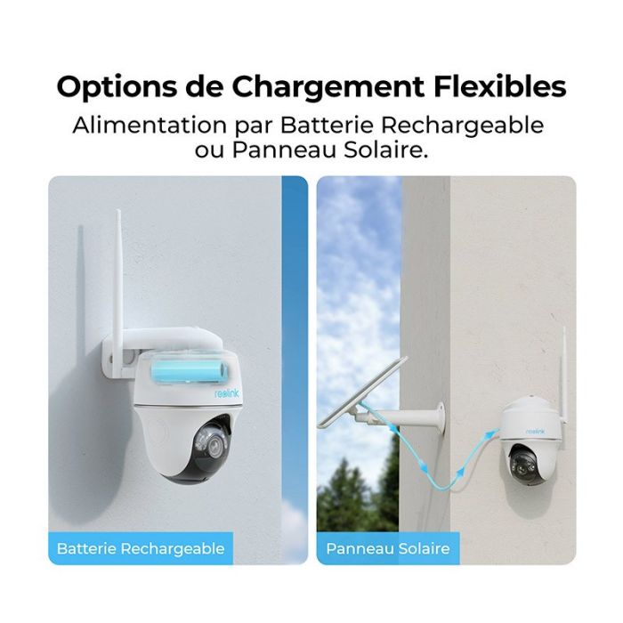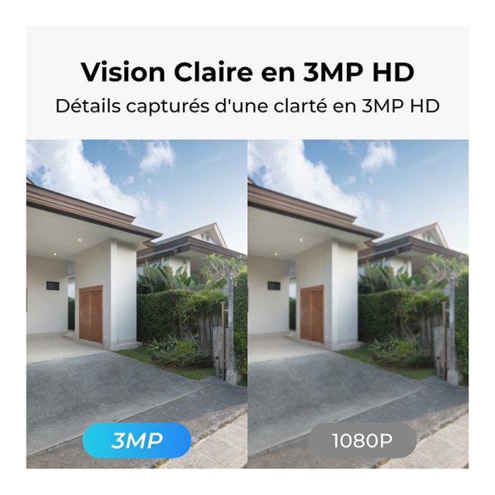 | Caractéristiques complémentaires | Caméra 2K 3MP sur batterie, motorisée + alimentation panneau solaire 3W- Champ de vision : 90° horizontal, 47° vertical et 110° diagonal- Vision nocturne en noir et blanc (infrarouge) jusqu'à 10 mètres- Batterie rechargeable 4800 mAh- Microphone et haut parleur intégrés- Alarme intelligente : détection PIR, des personnes et de véhicules- Compatible avec Google Assistant et Alexa- Stockage locale : carte micro SD maximum 128Go (vendu à part sur ce site) |