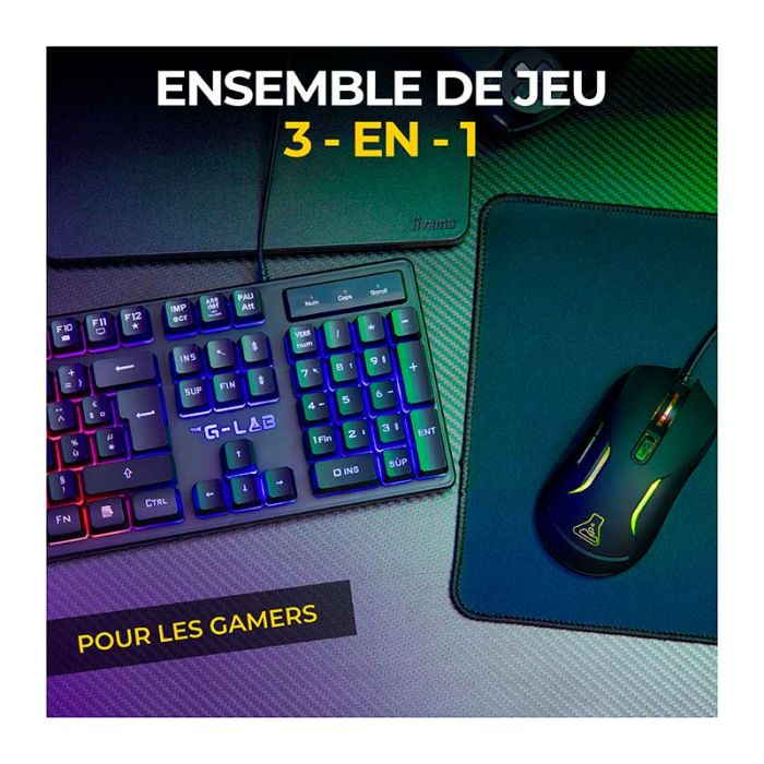 | Caractéristiques complémentaires | Combo Gaming 3-en-1 : clavier, souris et tapisOffrez-vous un setup complet et performant avec ce combo gaming 3-en-1, idéal pour les joueurs à la recherche de confort, de précision et d’immersion immédiate.Clavier rétroéclairé et réactifLe clavier au rétroéclairage Rainbow offre une excellente visibilité et un look gaming. Sa membrane silencieuse, ses 12 raccourcis multimédias et son anti-ghosting 6 touches garantissent une frappe fluide et précise. La fonction Windows Lock sécurise vos parties en évitant toute sortie accidentelle.Souris 3600 DPI haute précisionProfitez d’un contrôle optimal grâce à une souris jusqu’à 3600 DPI, un taux de rafraîchissement 125 Hz et 6 boutons rapides. Son rétroéclairage 7 couleurs et son design ergonomique assurent confort et style sur de longues sessions.Tapis optimisé et installation immédiateLe tapis (250 × 210 × 2 mm) offre une surface stable et précise pour vos mouvements.Compatible PC et PS4, le combo fonctionne en Plug & Play pour une installation instantanée. |
