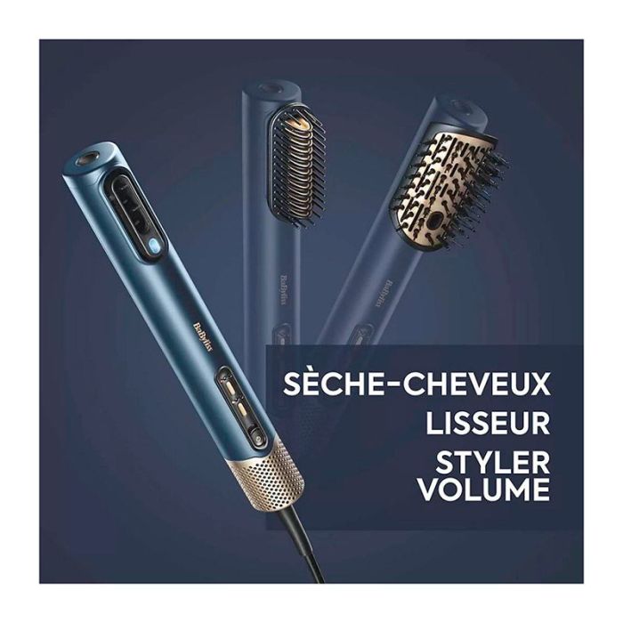 | Caractéristiques complémentaires | SÈCHE-CHEVEUX. LISSEUR. STYLER VOLUME.Le Multistyler Air Wand de BaByliss est un appareil révolutionnaire aussi bien par son désign compact et léger que par ses fonctionnalités avancées.Il est doté d'un moteur numérique haute vitesse qui émet un flux d'air ultra-rapide de 123Km/h et d'une puissance de 1600W. Ce styler vous offrira une expérience de séchage aussi efficace qu'un sèche-cheveux traditionnel. Son flux d’air ultra-concentré et sa sortie d’air sont spécialement conçus pour offrir une vitesse maximale et une pression d’air optimale.Dôté d'un embout lisseur, vous pourrez réaliser un lissage haute performance sur cheveux mouillés pour un gain de temps incontestable. Le lissage par air chaud protège vos cheveux et offre un lissage sans chaleur extrême pour préserver la fibre capillaire. L'embout est composé de nombreuses plaques de précision en céramique, spécialement conçues pour un lissage sans effort même sur les cheveux mouillés. Ses picots souples démêlent et disciplinent le cheveu pour un lissage facile dès la racine.Le styler Air Wand de BaByliss possède également une brosse ovale qui sera votre compagnon idéal pour réaliser un brushing digne d'un salon même sur cheveux mouillés. Grâce à sa forme incurvée unique, vous pourrez apporter du volume à vos cheveux dès la racine. Cette brosse est composée de picots démêlants qui facilitent le coiffage et de poils souples qui donnent aux cheveux un résultat soyeux, lisse et brillant.Cet appareil 3 en 1 possède une technologie anti-frizz qui grâce à la combinaison de ions positifs et négatifs élimine les frisottis, l'électricité statique et mèches rebelles et apporte une douceur incroyable à votre chevelure.Le Styler Air Wand de BaByliss vous offre 3 vitesses d'air et 4 réglages de température afin de s'adapter à tous les types de cheveux. La fonction Air Froid permet de fixer la coiffure pour un résultat longue tenue.En sélectionnant le mode Ultra-Care, l'appareil alternera automatiquement une diffusion d'air froid et d'air chaud afin de baisser la température et obtenir un séchage doux pour encore plus de protection de votre chevelure.Son filtre arrière, conçu pour optimiser le flux d'air, est amovible pour faciliter le nettoyage de l'appareil.Le styler Air Wand de BaByliss au design compact et au poids léger sera facilement transportable pour faciliter tous vos déplacements et vous permettra d'avoir un seul appareil pour plusieurs types de coiffure différentes.Le cordon professionnel et rotatif de 2,5m vous offrira un grand confort d'utilisation. |