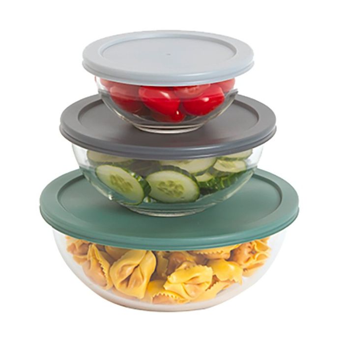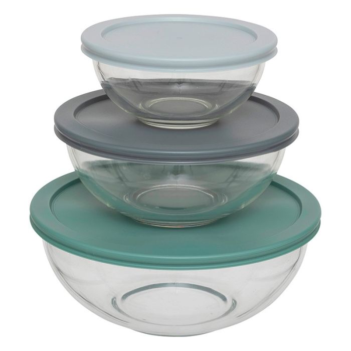 | Caractéristiques complémentaires | Lot de 3 saladiers en verre avec couvercle plastiqueContenances : 0,40, 1L et 2LDiamètre Petit : 14,7cm Hauteur 6,5 cmDiamètre Moyen : 18,6 cm Hauteur 7,8 cmDiamètre Grand : 22,5 cm Hauteur 9,2 cm |