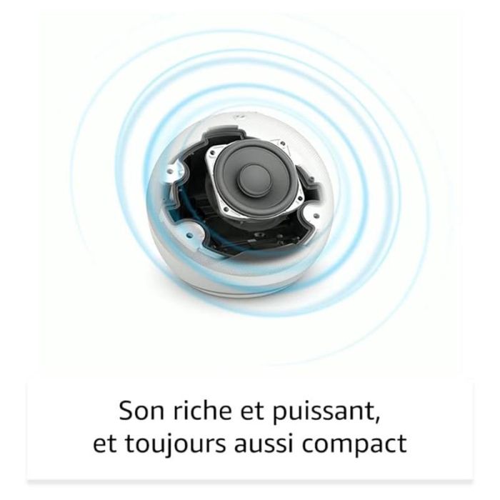 | Caractéristiques complémentaires | UN SON PUISSANT : expérience audio améliorée, avec des voix plus claires et des basses plus profondes, pour une expérience Echo Dot immersive.MUSIQUE ET PODCASTS : écoutez de la musique, des livres audio et des podcasts depuis Amazon Music, Audible, Apple Music, Spotify, Deezer et bien plus, via Wi-Fi ou Bluetooth.TOUJOURS LÀ POUR AIDER : demandez à Alexa de vous donner la météo, programmer des minuteurs, répondre à vos questions ou vous divertir.SIMPLIFIEZ-VOUS LA VIE : contrôlez les appareils connectés compatibles avec votre voix ou programmez des routines relatives à la température.ENCORE MIEUX ENSEMBLE : synchronisez plusieurs appareils Echo compatibles ou jumelez-les avec votre Fire TV pour une expérience cinématographique.PROTECTION DE LA VIE PRIVÉE : cette enceinte est dotée de multiples éléments de contrôle de la vie privée, dont un bouton Arrêt microphone vous permettant de déconnecter électroniquement les microphones.CONÇU DE MANIÈRE DURABLE : 99 % de l’emballage provient de forêts gérées de manière responsable ou de filières de recyclage, 95 % du tissu utilisé provient de tissus recyclés post-consommation et 55 % des plastiques utilisés proviennent de plastiques recyclés post-consommation.Connectivité WiFi dual bande (2,4GHz et 5GHz)Compatibilité Smart Home : WiFi, Bluetooth, Zigbee, Matter. L'application ALEXA est compatible avec les appareils Fire OS, Android et iOS. ALEXA parle le français, l'anglais, l'allemand, l'italien et l'espagnol. |
