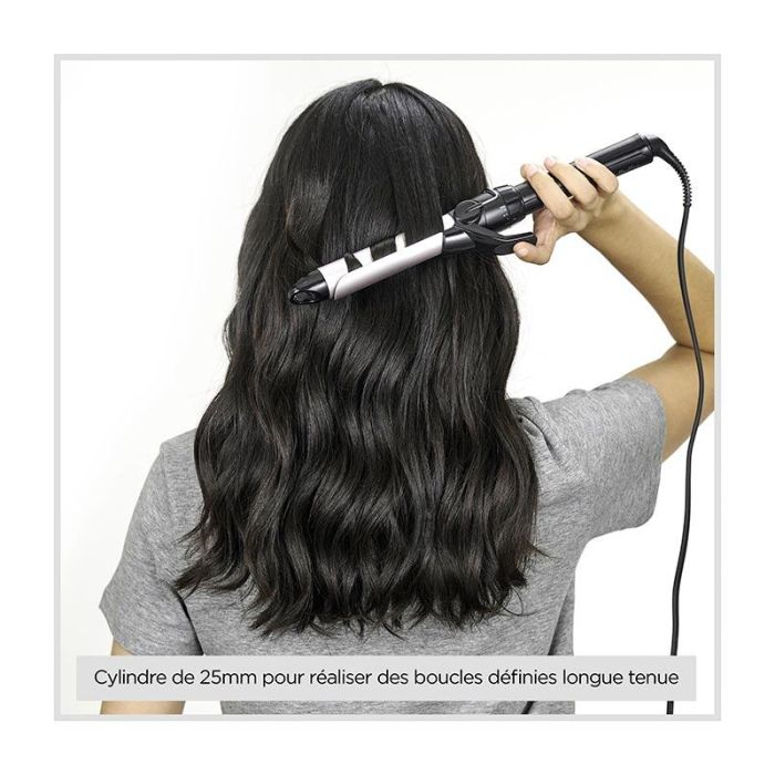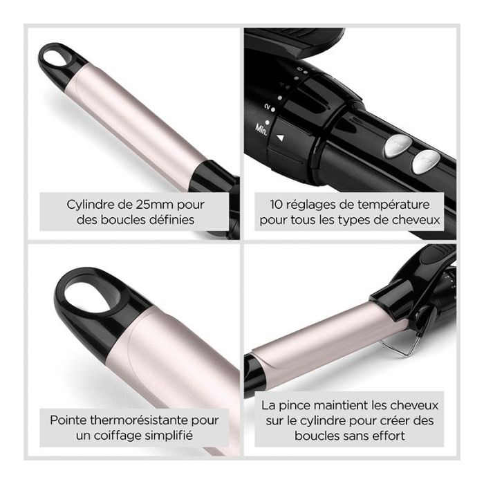 | Caractéristiques complémentaires | BOUCLEUR MANUEL À PINCE BaByliss (C325E) Design et Format : Boucleur cylindrique à pince doté d'un diamètre de 25 mm, idéal pour réaliser des boucles rebondies et parfaitement définies. Respect du Cheveu : Équipé du revêtement Sublim'Touch pour une glisse ultra-douce et une protection de la fibre capillaire. Précision Thermique : Propose 10 niveaux de température (de 110°C à 180°C) pour s'adapter avec précision à toutes les natures de cheveux. Rapidité d'Action : Chauffe ultra-rapide prête à l'emploi en seulement 60 secondes. Sécurité de Pose : Intègre un support de sécurité pour poser l'appareil chaud sans risque et un embout ventilé pour une manipulation sans brûlure. Tranquillité d'Esprit : Système d'arrêt automatique intégré pour sécuriser l'utilisation au quotidien. Indicateur Visuel : Présence d'un témoin LED permettant de visualiser instantanément l'état de chauffe de l'appareil. Maniabilité : Grande liberté de mouvement grâce à son cordon rotatif de 1,8 m. |