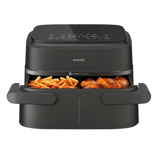 | Caractéristiques complémentaires | Un Airfryer compact pour deux plats ou un seul plat XXL : Cuisinez deux plats à la fois avec le séparateur amovible entre les 2 paniers, ou un seul plat XXL • Le séparateur amovible vous permet de transformer votre Airfryer double panier en un simple panier d'une capacité XXL • 2 paniers de 3.55L pour une capacité totale de7.1L • Une fonction synchronisation pour que vos deux plats soient cuits et prêts à être servis ensemble • Écran tactile avec 6 préréglages pour une cuisine simple et rapide • Fonction réchauffage • Des plats plus sains avec jusqu'à 90% de matière grasse en moins • Économisez jusqu'à 70% d 'énergie et40% de temps avec l'Airfryer Philips,en comparaison par rapport à un four traditionnel • Fonction Rapid Air Plus pour cuire vos plats préférés à la perfection • De délicieuses recettes adaptées à votre Airfryer sur l’application HomeID • Pièces détachables compatibles lave-vaisselle, pour un nettoyage facile Airfryer Double Panier Série 1000 NA150/00 11 ans de disponibilité des pièces détachées |