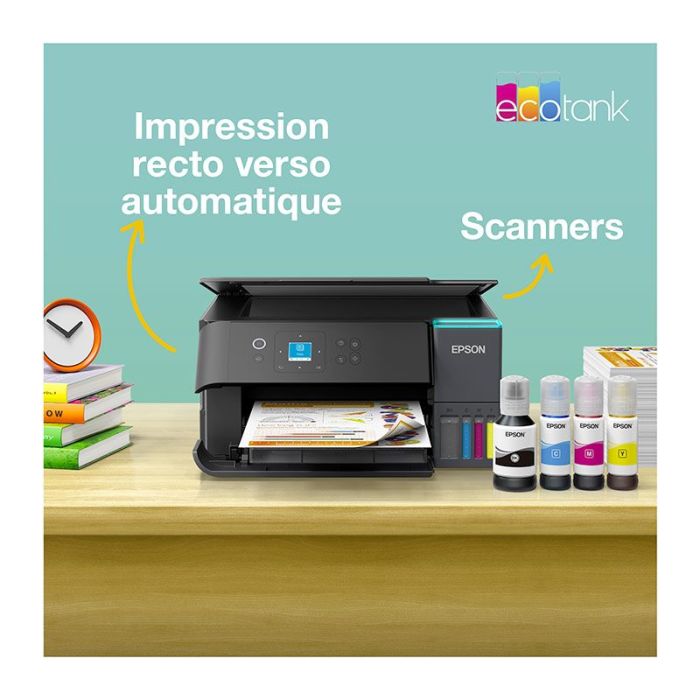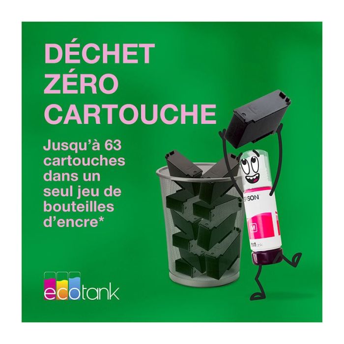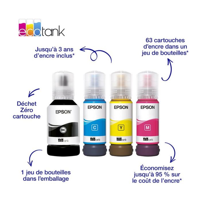 | Caractéristiques complémentaires | CARACTÉRISTIQUES PRINCIPALES ► Économisez jusqu’à 95 % sur le coût de l’encre* grâce aux réservoirs d’encre rechargeables ► Une impression simplifiée, avec l’équivalent de jusqu’à 63 cartouches dans un jeu de bouteilles* ► Jusqu’à 3 ans d’encre inclus dans la boîte* ► Un jeu de bouteilles permet d’imprimer jusqu’à 8 500 pages en noir et 6 500 pages en couleur* ► Imprimante multifonction A4 avec impression recto verso ► Impression recto verso, numérisation, copie et fax de haute qualité, tout-en-un ► Système simple de réservoir d’encre à recharger avec des bouteilles ► Détrompeurs intégrés sur les bouteilles EcoTank pour un rechargement sans difficulté ► Connexion sans fil fiable pour imprimer où que vous soyez ► Application Epson Smart Panel : configurez, surveillez, imprimez et plus encore depuis votre smartphone |