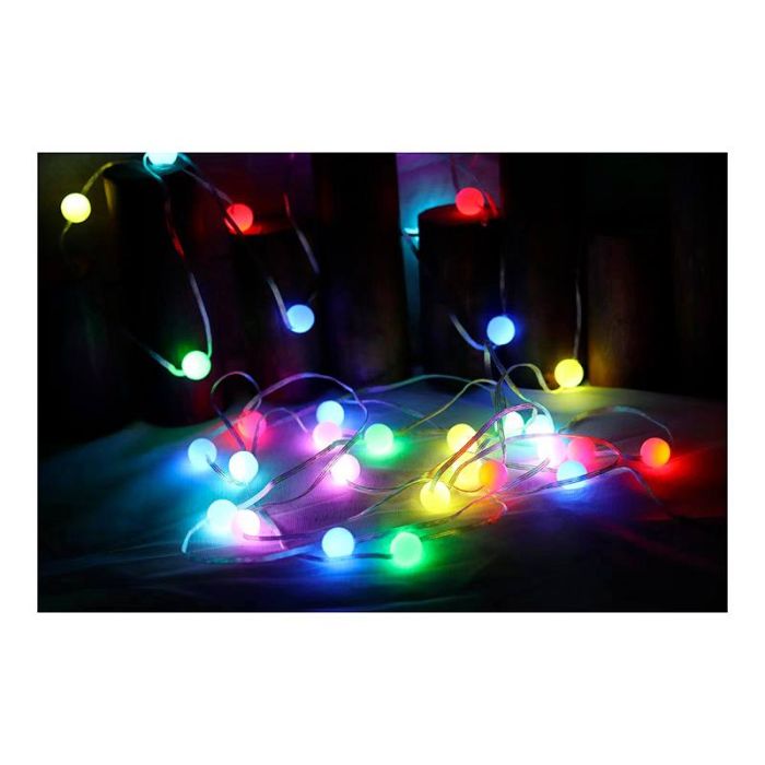 | Caractéristiques complémentaires | Guirlande petites boules RGB / décoration intérieureLongueur totale : 5 mètres40 mini boules LED, espacement 10cmLongueur câble USB : 1 mètreAlimentation par câble USBTension de sortie : 5VPuissance max : 3,3WTempérature de couleur: RVBNiveau d’étanchéité : IP20 Connexion par Bluetooth + WifiContrôle par smartphone avec App Tuya SmartCompatible contrôle vocal Google Home ou Alexa |