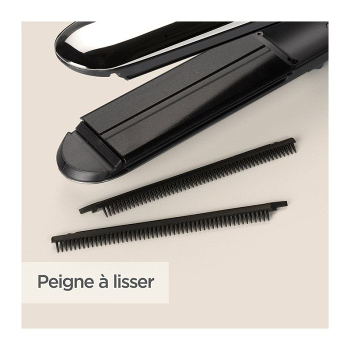| Caractéristiques complémentaires | PROTECTION ET EFFICACITE RENFORCEEDOUCEUR ET BRILLANCE DURABLESPOUR TOUS LES STYLES : 2en1- Lisse rapidement : plaques XL de 39 x 100mm Boucle en toute simplicité : revêtement extérieur incurv chauffantEFFICACITE ET PROTECTION OPTIMALES POUR CHEVEUX EPAIS, FRISES ET FRAGILISES- Lissage parfait en un seul passage : plaques XL 39mm et vapeur- Résultat uniforme de la racine à la pointe : vapeur en continu grâce au générateur électronique de vapeur- Cheveux préservés : la vapeur pénètre dans la fibre capillaire pour l'hydrater et la protéger- Cheveux doux et brillants sans frisottis avec la fonction ionique- Température régulée pour une efficacité renforcée et un résultat uniforme : système breveté Advanced Ceramics- Efficacité renforcée sur cheveux bouclés grâce aux peignes amoviblesCONFORT D'UTILISATION- Rangement facilité : système de verrouillage des plaques- Pas de risque de brûlure : repose-pouces amovibles |
