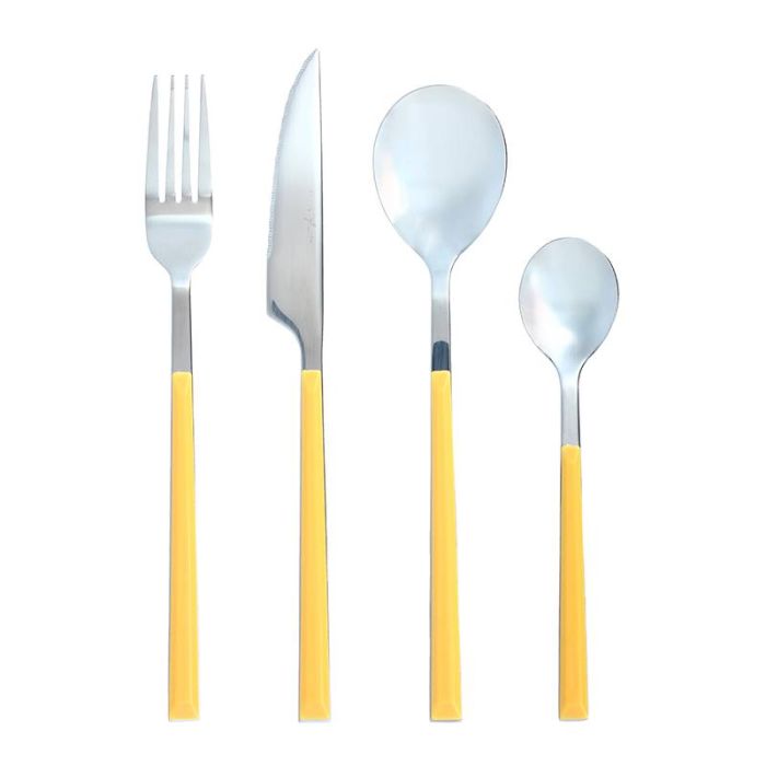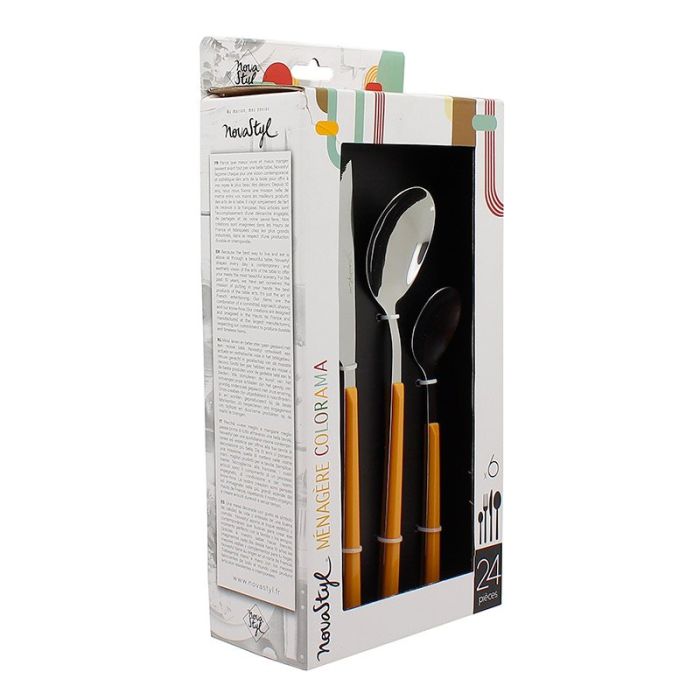 | Caractéristiques complémentaires | Ménagère 24 pcs - 6 personnes - coloris jaune safran- 6 couteaux steak- 6 fourchettes- 6 cuillères de table- 6 cuillères à café- Résistant aux chocs, matériau léger et esthétique- Acier inoxydable épaisseur 1.8mm- Équilibre parfait entre résistance et durabilité |