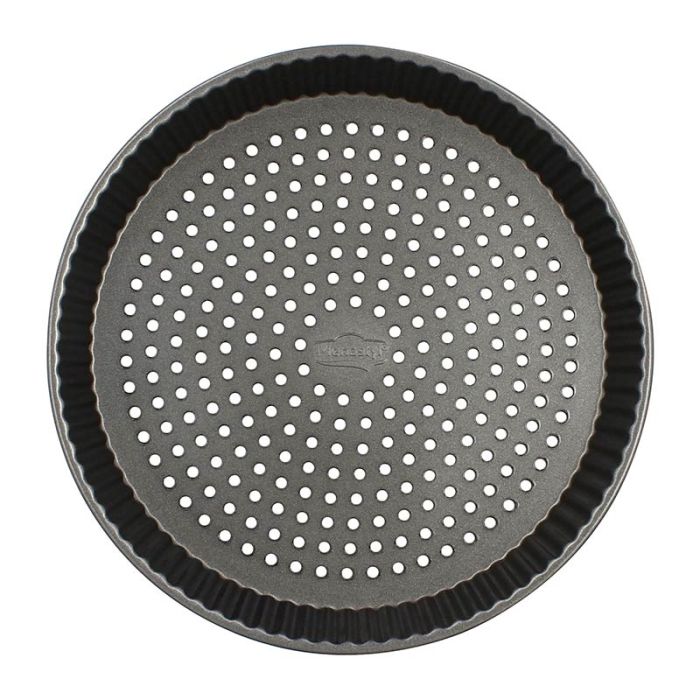| Caractéristiques complémentaires | Moule à tarte en acier inox revetu, solide et durable! Diamètre 32 cmFond perforé pour une meilleure répartition de la cuissonEpaisseur de l'inox: 0.4mm |