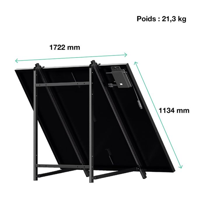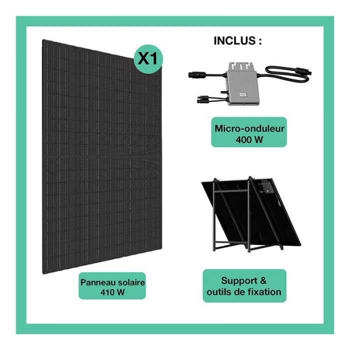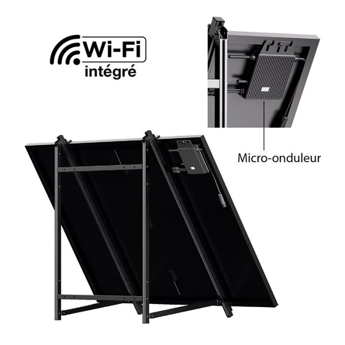 | Caractéristiques complémentaires | • Au sol, au mur ou sur Balcon:Vous avez une multitude de combinaisons pour incliner l'installation selon l'ensoleillement et bénéficier d'une production d'énergie optimale.Minimum de 2m² de surface avec une orientation SUD ou EST. Inclinaison de 30° à 60°.• Suivre sa production en temps réel:Via une application compatible Google play et App store, vous pouvez suivre votre production en direct, voir votre historique jour/mois/année et aussi valoriser votre impact carbone• 96.7% de Performance:Un rendement efficace du micro-onduleur pour une production maximale. Résistant à l'eau IP67. |