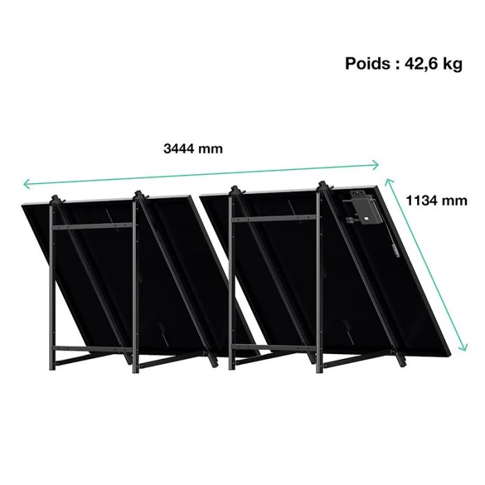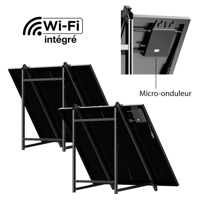| Caractéristiques complémentaires | • Au sol, au mur ou sur Balcon:Vous avez une multitude de combinaisons pour incliner l'installation selon l'ensoleillement et bénéficier d'une production d'énergie optimale.Minimum de 4m² de surface avec une orientation SUD ou EST. Inclinaison de 30° à 60°.• Suivre sa production en temps réel:Via une application compatible Google play et App store, vous pouvez suivre votre production en direct, voir votre historique jour/mois/année et aussi valoriser votre impact carbone• 96.7% de Performance:Un rendement efficace du micro-onduleur pour une production maximale. Résistant à l'eau IP67. |