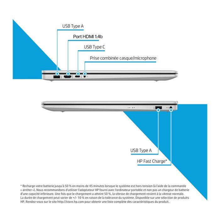 | Caractéristiques complémentaires | HP Fast ChargeLorsque la batterie de votre ordinateur portable est faible, vous ne souhaitez pas attendre des heures avant qu’elle soit rechargée. Éteignez votre appareil et passez de 0 à 50 % de charge en 45minutes environ.Jusqu’à 7 heures et 15 minutes41WhPanneau antirefletsGrâce à ce panneau anti reflets, vous pouvez profiter du soleil tout en utilisant votre ordinateur. Utilisez votre ordinateur en extérieur grâce àl'écran anti refletDoubles haut-parleursProfitez pleinement de votre musique, de vos films ou de vos jeuxpréférés grâce aux doubles haut-parleurs stéréoClavier pleine taille avec pavé numérique intégréLe clavier pleine taille avec pavé numérique intégré vous permet detaper confortablement et d'augmenter la productivité avec unecourse de touche de 1,5 mm |