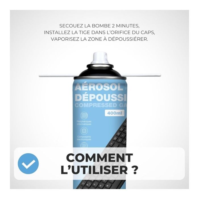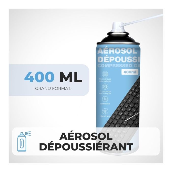 | Caractéristiques complémentaires | Lot de 2 Bombes Dépoussiérantes APM (2 x 400ml) Un nettoyage puissant et sans risque pour tous vos appareils électriques et multimédias. Ce lot de 2 aérosols de 400ml est la solution parfaite pour chasser la poussière des endroits les plus inaccessibles. ► Points Forts Action ciblée : Souffle puissant pour atteindre les recoins difficiles d'accès. 100% Sécurisé : Dépoussière l'électrique et l'électronique sans dommage. Multi-usages : Idéal pour claviers, appareils photo, imprimantes, rasoirs, aspirateurs... Format économique : Lot pratique et durable (2 x 400ml). |