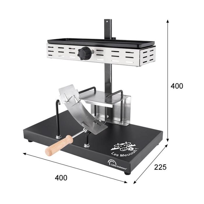 | Caractéristiques complémentaires | Raclette traditionnelle, idéale pour un repas montagnard authentique et convivial, avec une demi meule ! - 850W : parfait pour faire fondre rapidement du fromage pour 6 personnes - Thermostat réglable. - Design Meuuuh...! différenciant + 2 spatules. - Porte fromage inox coulissant, pivotant et réglable pour une fonte parfaite. - Appareil design et fabriqué en acier inoxydable pour durer. - Grill supérieur en revêtement antiadhésif en microsilicone - sans PFAS. |