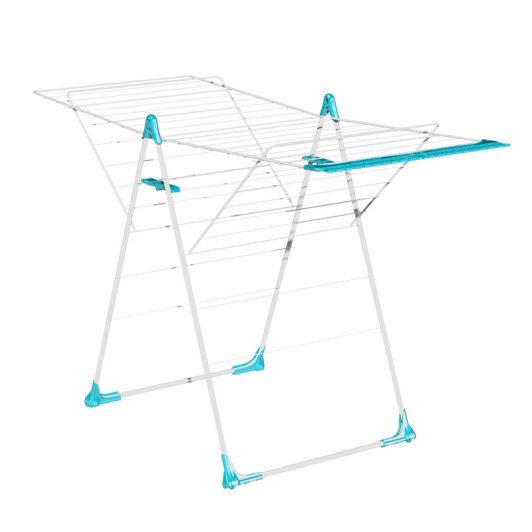 | Caractéristiques complémentaires | Séchoir classique à ouverture simplifiée - Utilisable en demie-ouverture pour étendre les petites lessives - Multipositions des ailes pour étendre les grandes pièces de linge (draps...) - Coins de protection anti-rayure - Facile à déplacer avec ses roulettes mono directionnelles - Pratique avec son porte chaussettes , petite lingerie en bout d'aile - Cadre en tube d'acier, recouvert de peinture époxy blanche et brillante - Grille en fil d'acier soudé, recouvert de plastique pour une meilleure protection du linge Accessoires bleus (coins, porte chaussettes) Dimensions produit en utilisation : H 94cm x P 61cm x L 156 cm |