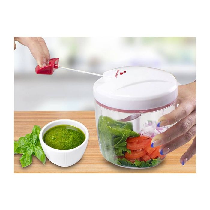 | Caractéristiques complémentaires | Le hachoir manuel à corde est idéal pour hacher sans effort sans avoir à se connecter à l'électricité. Simple et facile à utiliser, il suffit de tirer plusieurs fois sur la poignée. L'unité de coupe avec 5 lames en acier permet un excellent hachage. Récipient transparent de 1000 ml, lavable au lave-vaisselle. Avec serrure de sécurité.Dimensions : 13 x 13 x 14 cm |