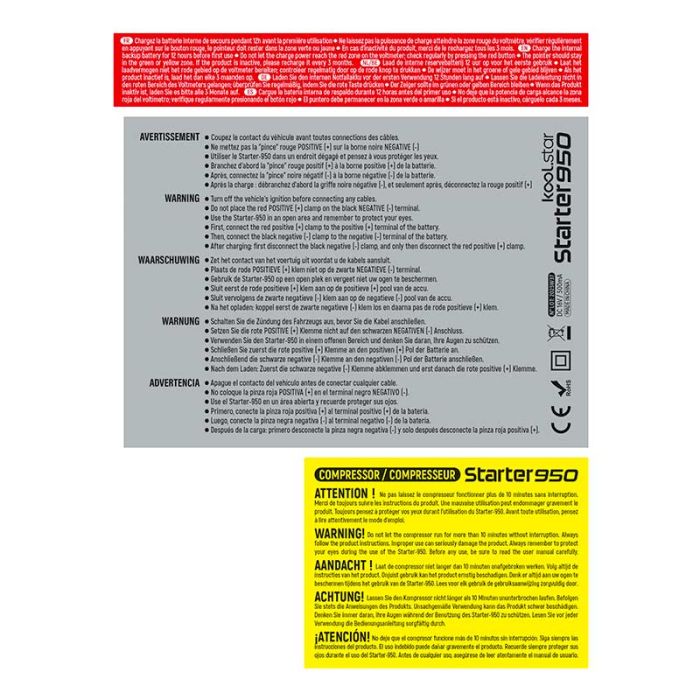 | Aanvullende kenmerken | BOOSTER ACCU 12V—15AH - Voltmeter die het interne laadniveau van de accu aangeeft - 12V 15A met LED-ladingsindicator - Automatische bescherming tegen overstroom in het circuit - Piekstroom: 900Ah - Startstroom: 450Ah - DC-aansluitingen: 12V - AC-oplaadadapter uitgang: 15V, 500mA - Negatieve en positieve klemmen - AC/DC-voedingskabel (inbegrepen) - 12V opladen via sigarettenaansteker (kabel inbegrepen) - Nood- en werk-LED-licht 3,2V/0,5W - Polariteitswaarschuwingssignaal - Luchtcompressor: 18 BAR / 260 PSI - Drukmeter - Extra mondstukken (bal, standaard) inbegrepen - Oplaadtijd: 20 uur - Accu: Onderhoudsvrije lood-zuur accu, 12V-15Ah - Geschikt voor dieselmotoren kleiner dan 2.0L - Geschikt voor benzinemotoren kleiner dan 3.0L |
