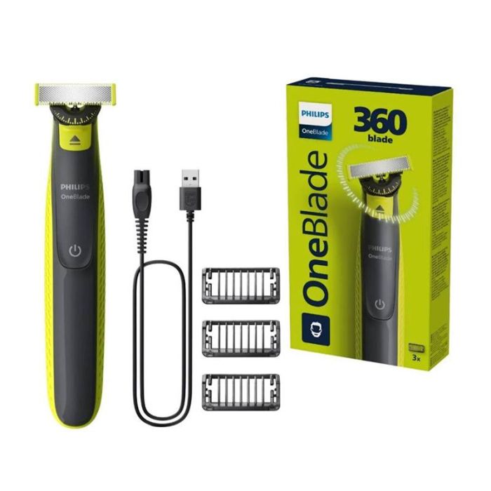 | Aanvullende kenmerken | Trimmen, stylen en scheren van elke gewenste lengte Ontworpen om haren te knippen, niet de huid De nieuwe OneBlade 360 scheerapparaat trimt, stylet en scheert haren van elke lengte, eenvoudig en snel. Scheer en trim moeiteloos, zelfs op de moeilijkst bereikbare plekken*. Geen meerdere stappen of accessoires meer nodig. De OneBlade voldoet aan al uw behoeften: Makkelijk in gebruik Lange batterijduur 100% waterdicht Creëer precieze contouren en scherpe lijnen Laadt overal en altijd op Een mesje dat niet snel bot wordt Comfortabel scheren Scheren Nieuw 360-mesje Scherpe contouren Bepaal de contouren Gelijke snede 3 klikbare baardkammen voor 3-dagen baard (1, 3, 5 mm) Unieke OneBlade technologie |