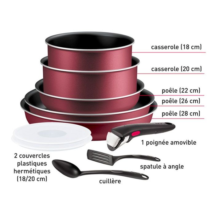 | Aanvullende kenmerken | Kookset TEFAL INGENIO 10-delig: - 3 pannen 22 26 28 cm - 2 steelpannen 18 20 cm - 2 kunststof deksels 18 20 cm - 1 afneembaar handvat - 2 keukengerei: lepel en schuine spatel * Franse fabricage: Deze kookset is gemaakt in Frankrijk (met uitzondering van de deksels en accessoires). Alle Tefal-producten worden vervaardigd volgens de strengste kwaliteitsnormen, ongeacht de productielocatie. * De lichtste Ingenio inductiepan*: Dankzij onze nieuwe Light Tech-technologie zijn de Ingenio Simply Cook-pannen tot 28% lichter (in vergelijking met de klassieke Ingenio Eco-Resist inductiereeks van Tefal). * Titanium anti-aanbaklaag: Titanium coating voor hoge anti-aanbakeigenschappen, wat zorgt voor moeiteloos schoonmaken en koken waarbij alle smaken en voedingsstoffen behouden blijven. * Stevig Ingenio-handvat: Een afneembaar handvat voor intensief gebruik met volledige gemoedsrust: 3-punts bevestigingssysteem dat tot 10 kg kan dragen (volgens interne tests) en 10 jaar garantie heeft (deze Tefal-garantie beïnvloedt niet de wettelijke rechten van de consument, die niet kunnen worden uitgesloten of beperkt, noch de rechten tegenover de verkoper waar het product is gekocht). * Anti-aanbaklaag aan de binnenzijde: Ontworpen om te voldoen aan uw dagelijkse kookbehoeften, garandeert de hoogwaardige binnen- en buitenanti-aanbaklaag optimale kookprestaties en eenvoudig schoonmaken. * Snelle opwarming: Dankzij Light Tech-technologie warmt de pan razendsnel op voor snel koken. Compatibel met alle kookoppervlakken, inclusief inductie. |