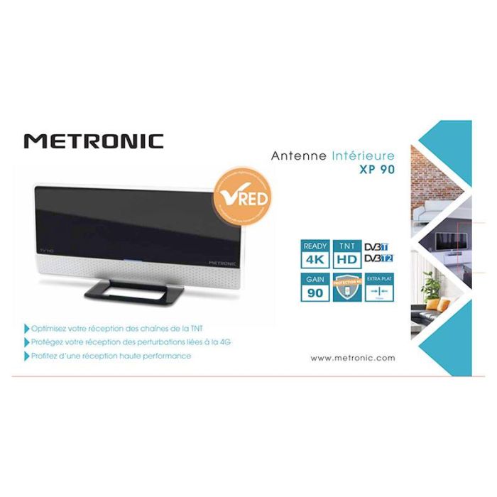 | Aanvullende kenmerken | Strak, design en extra plat, past hij perfect in uw interieur. Dankzij de muurbevestiging en de geïntegreerde voet kunt u hem aan de muur bevestigen of op een meubel plaatsen. Ontvangst van TNT-kanalen in HD (UHD 4K). Kan gevoed worden via een TNT-adapter of een televisie (voorzien van 5V-functie) Winst 90 (19,5 dB) Vermindert storingen door 4G / 5G (geïntegreerd filter) Compatibel met DVBT / DVB-T2 Conform RED-richtlijn UHF: 460 - 790 MHz |