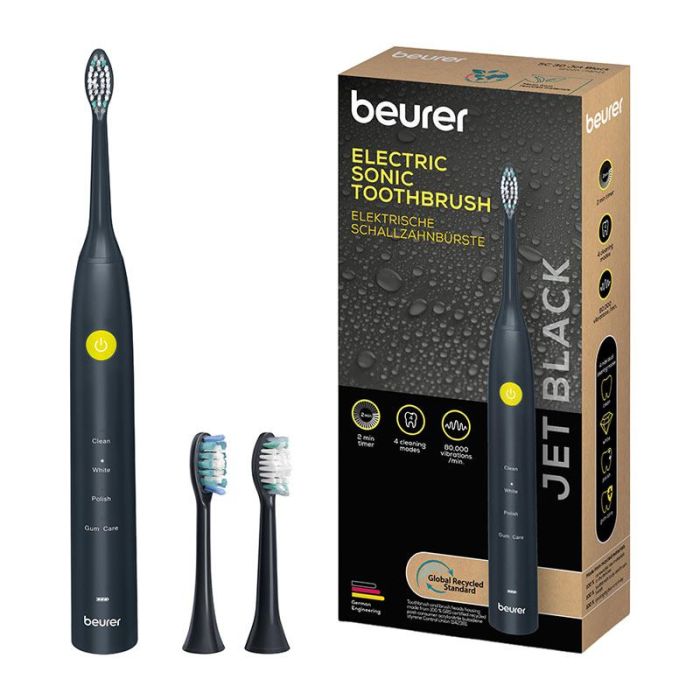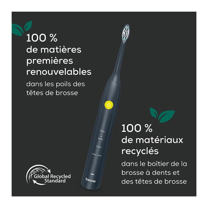 | Aanvullende kenmerken | SONISCHE ELEKTRISCHE TANDENBORSTEL BEURER SC30 Krachtige sonische technologie voor een volledige verwijdering van tandplak 4 individuele reinigingsprogramma’s: Clean, White, Polish, Gum Care 80.000 oscillaties/min Ingebouwde timer van 2 minuten en kwadranttimer Krachtige batterij met 15 dagen autonomie LED-laadindicator Handige reissluiting Inclusief 2 borstels (Classic Clean en Premium Whiten) en een USB-C oplaadkabel. Tandenborstel en borstelkoppen zijn gemaakt van 100% gerecycleerde materialen. 100% hernieuwbare grondstoffen in de haren Tandenborstelkoppen met indicatorharen Lithium-ion batterij: 600 mAh, 3,7 V Productafmetingen (HxØ): 160 mm (zonder borstelkop) x 28 mm Productgewicht: 125 g (tandenborstel + 2 borstelkoppen + oplaadkabel) 3 jaar garantie |