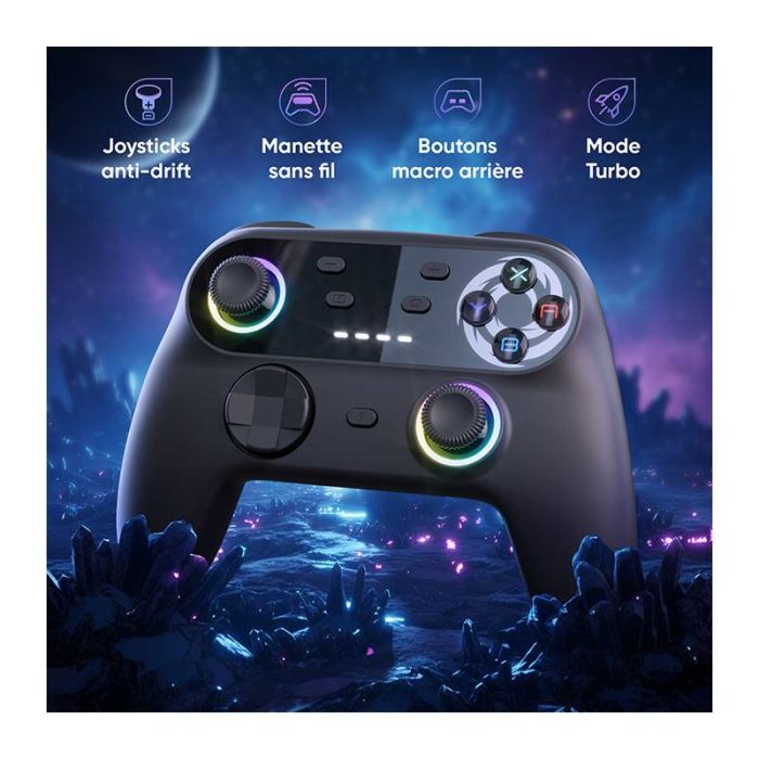 | Aanvullende kenmerken | Joysticks Hall Effect, programmeerbare achterknoppen, 6-assige gyroscoop, instelbare trillingen, Turbo-modus, 600mAh batterij, LED-modi op de joysticks. |