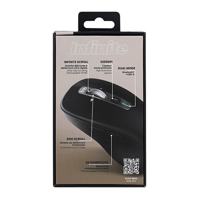 | Aanvullende kenmerken | ONTKOPPELBARE INFINI-WIEL EN ZIJKNOP► Draadloze muis met ontkoppelbare INFINI-scrollwiel. Scroll razendsnel door het wiel te lanceren.► Navigeer gemakkelijk en snel door grote documenten, zonder eindeloos te moeten scrollen om onderaan het document te komen.► Met de zijwaartse scrollfunctie navigeer je horizontaal door je bestanden en heb je volledige controle met je muis.► Gebruik je muis via Bluetooth of profiteer van de eenvoudige Plug & Play-verbinding met de USB-A dongle.► Steek in en navigeer onmiddellijk.► Hij heeft twee gemakkelijk toegankelijke sneltoetsknoppen aan de zijkant om naar de vorige of volgende pagina te gaan.► De automatische slaapstand verlengt de levensduur van de batterij wanneer de muis enkele minuten niet beweegt.► Uitstekende batterijduur dankzij de twee AA-batterijen.► Compatibel met elk apparaat met een USB-A-poort of Bluetooth-verbinding (Mac, pc, tablet...) |