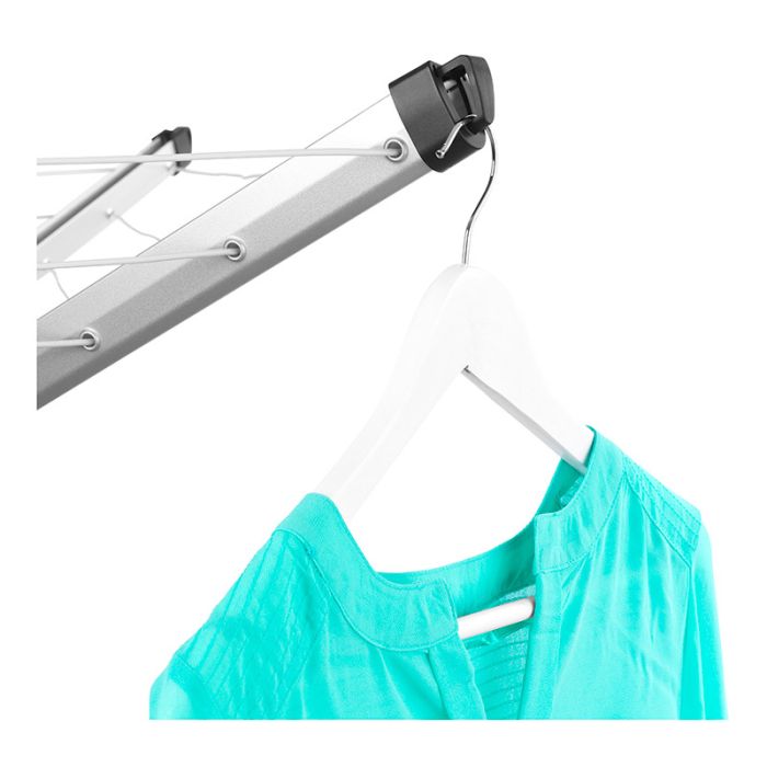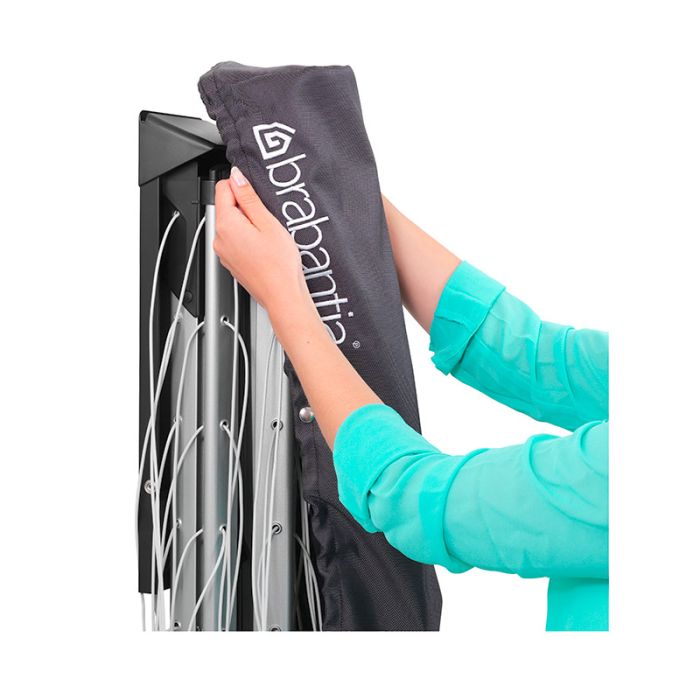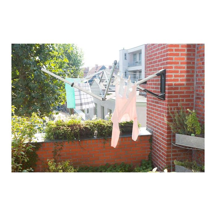 | Aanvullende kenmerken | Muurparaplu wasdroger BRABANTIA Gemakkelijk uit te klappen en in te klappen De buitenlijnen zijn 120 cm lang Alle waslijnen zijn van hoge kwaliteit, UV-bestendig en voorzien van een slim antislipprofiel om uw wasgoed op zijn plaats te houden. Voordelen en Functionaliteiten Ruimtebesparend - klapt tegen de muur wanneer hij niet in gebruik is. Grote ruimte - 24 meter waslijnen, geschikt voor twee wasbeurten. Goed voor de rug - hang hem op de ideale werkhoogte. Geschikt voor grote ruimtes - de buitenlijnen zijn 120 cm lang. Eenvoudige installatie - duidelijke stapsgewijze instructies, stevige muurbevestigingen en boormal inbegrepen. Goed voor de planeet - energiebesparing en ondersteuning van WeForest, dat zich inzet voor het planten van meer bomen. Blijft schoon - weerbestendige beschermhoes inbegrepen. Tijdloze uitstraling - metallic grijs gelakt frame en moderne zwarte hoes |