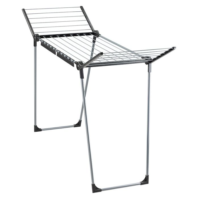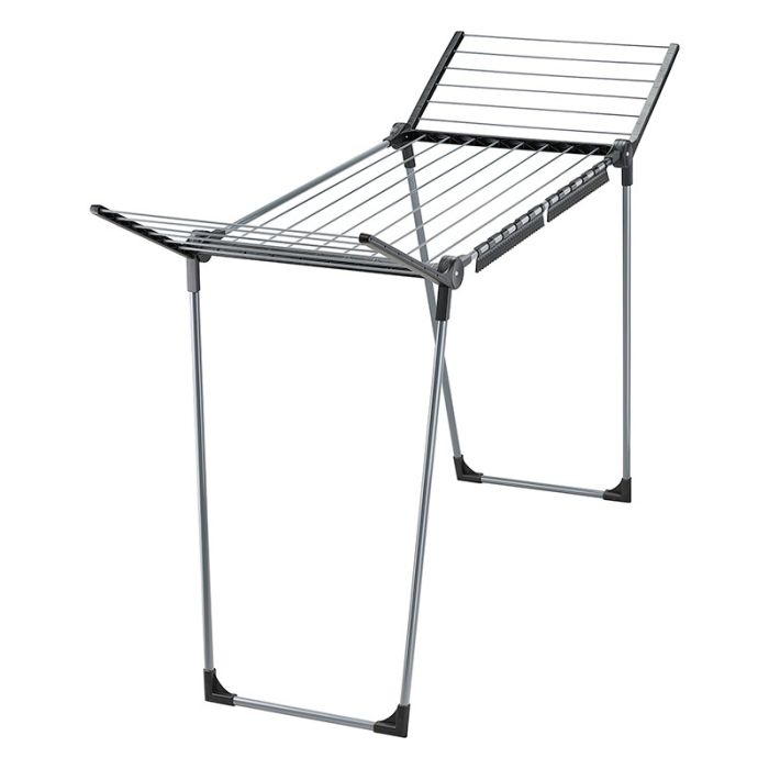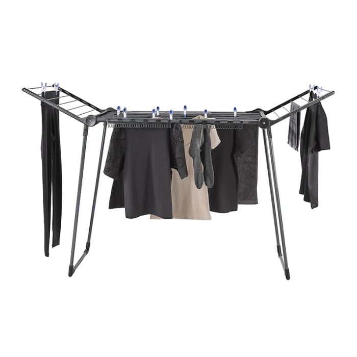 | Aanvullende kenmerken | PEGASUS 150 Black Edition droogrek› Drooglengte: 15 m› Vleugelhoogte: 105 cm› 2 houders om kleine kledingstukken op te hangen› Aantal wasbeurten: 1-2› Afmetingen: H 87 x B 157 x D 55 cm› 5 jaar garantie |