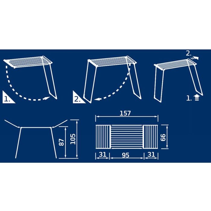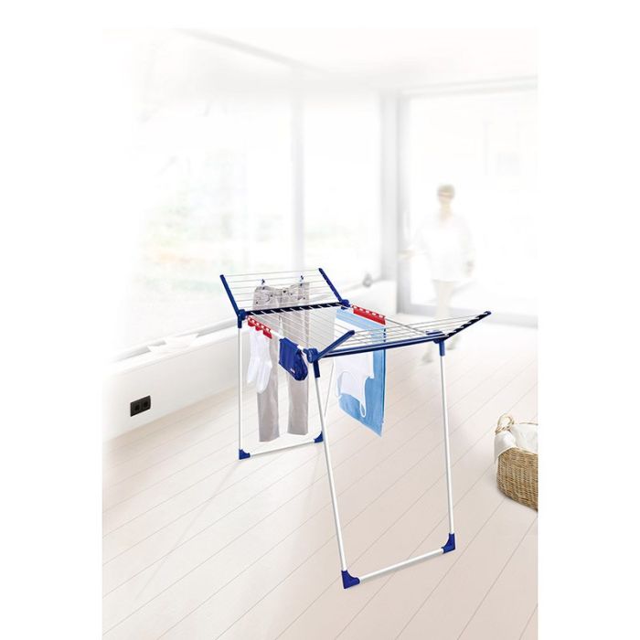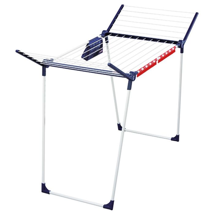 | Aanvullende kenmerken | › Lengte drooglijn: 18 m › Hoogte van de vleugels: 1,05 m om langere kledingstukken te drogen (broeken, lakens, ...) › 2 houders om kleine kledingstukken aan te hangen › Zak voor wasknijpers › Afmetingen: H 94 x B 157 x D 66 cm › Vulbeurten wasmachine: 1 tot 2 Afmetingen van het opgevouwen product: H 94 cm x B 66 cm x D 6 cm |