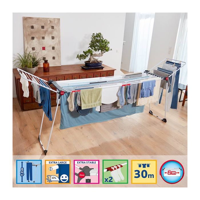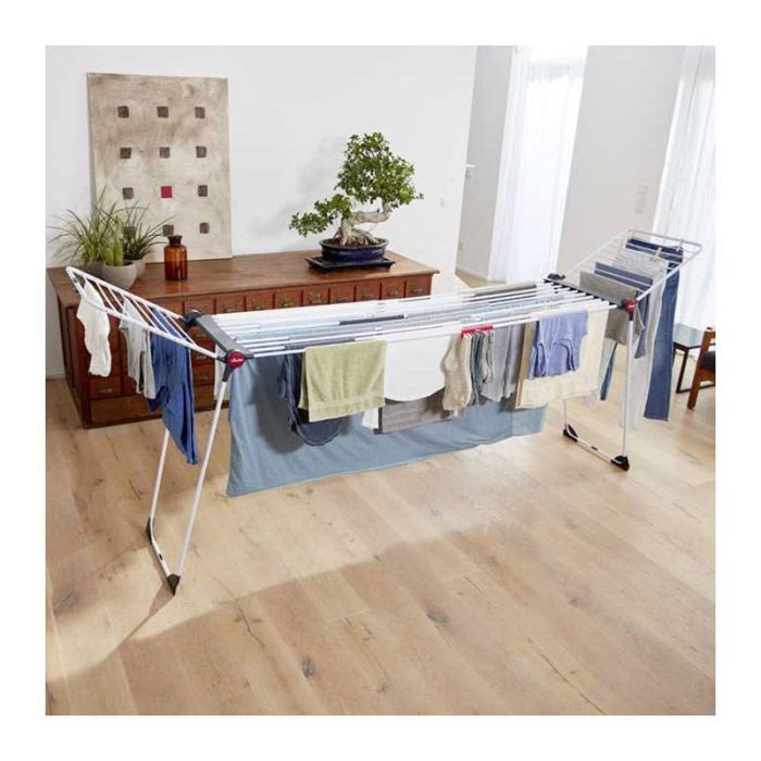 | Aanvullende kenmerken | · Perfect voor het wasgoed van het hele gezin (2-3 wasbeurten) Met de Vileda Infinity Flex is het drogen van tafelkleden, lakens of groot wasgoed makkelijker dan ooit, want deze grote droogrek biedt tot wel 30 meter droogruimte. Omdat de telescopische centrale steun 1 meter hoog is en uitschuifbaar van 117 cm tot 205 cm, kunt u grote stukken gemakkelijk ophangen zonder ze te vouwen. · Uitschuifbare centrale steun Het droogrek meet bij volledig geopend 216 tot 304 x 56 x 128 cm. De hoofdbalk bevindt zich op 1 m hoogte, waardoor lang wasgoed de grond niet raakt en het ophangen nog comfortabeler wordt. In gesloten toestand zijn de afmetingen 56 x 8 x 122 cm. · Ideaal voor lang wasgoed dankzij de hoge vleugels · Minder afdrukken dankzij de XXL draden · Ontworpen voor gebruik in alle omgevingen (binnen en buiten) · Eenvoudige vergrendeling van de vleugels Dankzij het vergrendelingssysteem van de vleugels, dat ongewenst openen voorkomt, is het droogrek makkelijk te sluiten en op te bergen. · Zeer stabiel en gebruiksvriendelijk De Vileda Infinity Flex is uitgerust met twee comfortabele wielen waarmee u het droogrek, zelfs als het vol hangt, overal naartoe kunt verplaatsen, binnen of buiten het huis. |