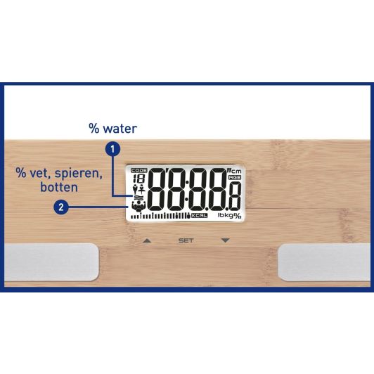 | Aanvullende kenmerken | Analyse van de massa's: % vetmassa, % watermassa, BMI-berekening Tot 12 gebruikers Ideaal voor uw fitnessprogramma |