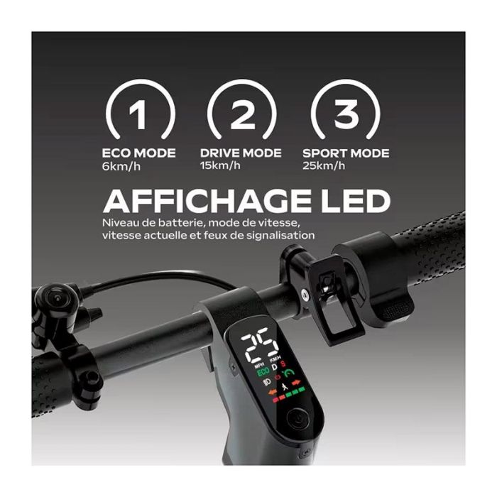 | Regelgevende tekst herverpakte mobiel | - Trottinette reconditionnée, contrôlée et testée (moteur,contrôleur,marquage, éclairage, roulement et vitesse). - Batteries neuves et contrôle de la charge. - Aspect impeccable. Peut présenter de très légères traces d’usure, invisibles à plus de 20 cm. - Livré dans un emballage neutre avec les accessoires neuf d'origine (chargeur et manuel). |