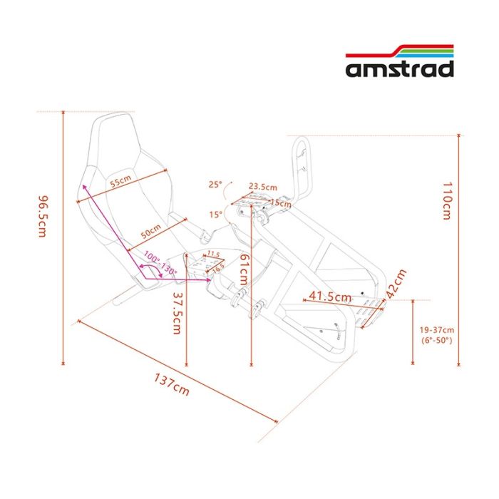 | Aanvullende kenmerken | ° Steun voor scherm tot 40"° Structuur in rond stalen buis van 42 mm° Rugleuning kantelbaar van 100 tot 130°° Draaibare stuursteun tot 40° Verstelbare hellingshoek van het pedaal (6°-50°)° Kantelbare schermsteun tot 25° |