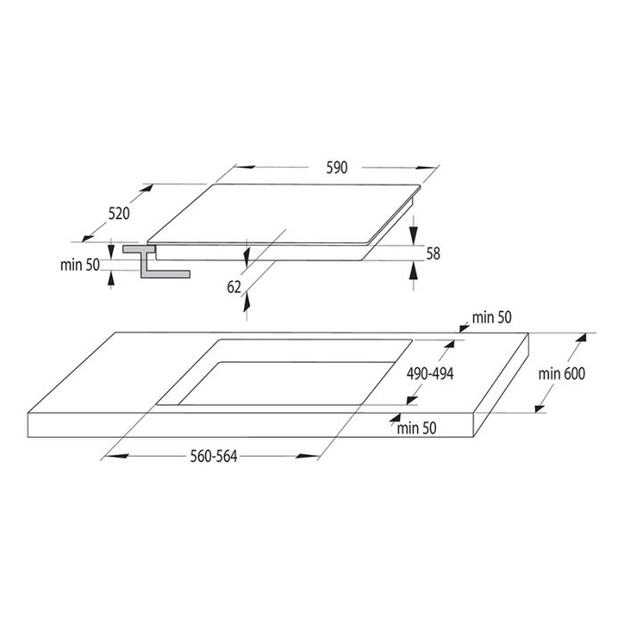| Inbouwafmetingen | H 6,5 cm x L 56.4 cm x P 49.4 cm |