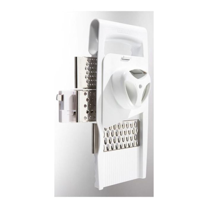 | Aanvullende kenmerken | Universele rasp 4+1 LEIFHEIT Vervangbare raspen om te raspen in vlokken, reepjes, snijden of schaven. De raspen kunnen aan de zijkant worden opgeborgen voor echte plaatsbesparing. Veiligheidsduwer |