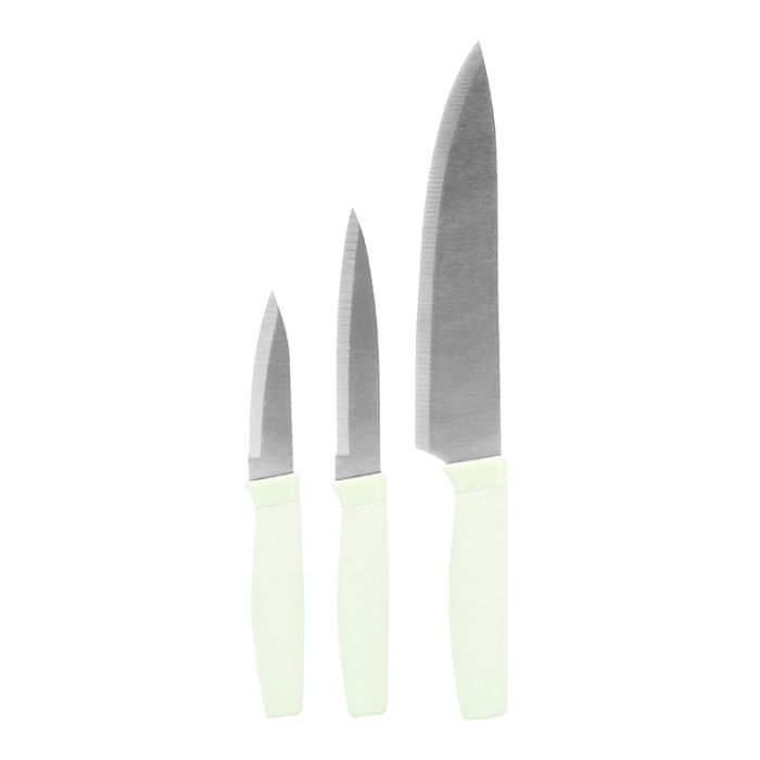 | Aanvullende kenmerken | Set van 3 messen met roestvrijstalen lemmet van 9 cm, 12,5 cm en 20,5 cm Soft touch handvat in kleur. (kleur naar keuze in de winkel, willekeurig bij afstandsverzending) Perfect om allerlei ingrediënten te snijden, hakken en in blokjes te snijden. |