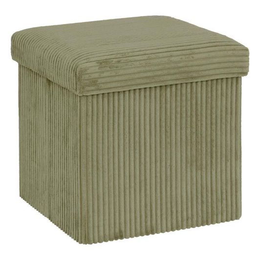 | Aanvullende kenmerken | Opvouwbare vierkante poef Afmetingen uitgeklapt 38x38 cm Kaki groene ribfluwelen stof Slim, deze poef biedt je zowel een comfortabele zitplaats als een discreet opbergruimte Maximaal draaggewicht: 110 kg |