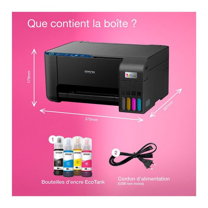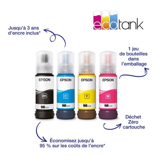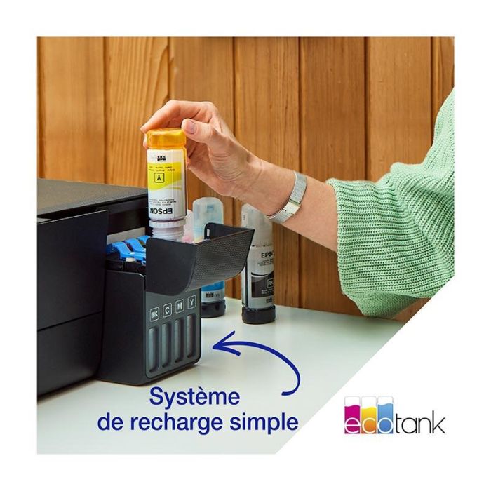 | Aanvullende kenmerken | ► Zeg vaarwel tegen cartridges EcoTank biedt eenvoudig thuis printen: de inktreservoirs met ultra hoge capaciteit zijn gemakkelijk bij te vullen en de flessen zijn voorzien van een inkeping om te voorkomen dat u de verkeerde kleur in het reservoir doet. Dankzij de inktniveaweergave aan de voorkant is het eenvoudig te zien wanneer bijvullen nodig is. ► Langdurige besparingen Deze multifunctionele printer helpt u tot 90% te besparen op uw afdruk kosten* en wordt geleverd met tot wel 3 jaar inkt*. Een set inktflesjes kan tot 4.500 pagina’s in zwart-wit en 7.500 pagina’s in kleur afdrukken*, wat overeenkomt met maximaal 72 inktcartridges!* ► Epson Smart Panel-app Met deze app kunt u uw printer bedienen vanaf uw mobiele apparaat*. U kunt documenten en foto’s afdrukken, kopiëren en scannen, maar ook uw printer instellen, controleren en problemen oplossen, allemaal vanaf uw telefoon of tablet. ► Tal van functies Dankzij een achterinvoer voor 100 vellen papier, randloze fotoprints (tot 10 x 15 cm) en printsnelheden tot 10 pagina’s per minuut*, kunt u snel en eenvoudig meerdere taken uitvoeren. * Zie epson.fr/ecotankfootnotes |