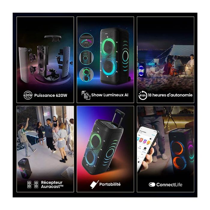 | Aanvullende kenmerken | IPX4 TWS Multiconnect (tot 10 luidsprekers met AURACAST-technologie) 18u Autonomie BASS BOOST 5 geluidsmodi 1 micro-ingang 1 gitaar-ingang Wieltjes |