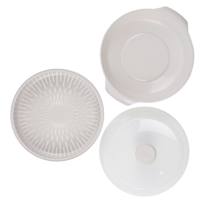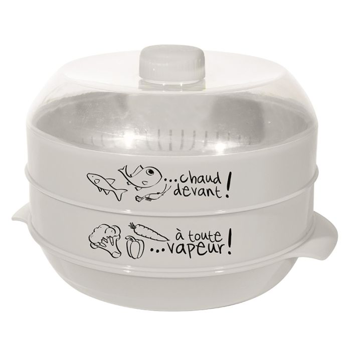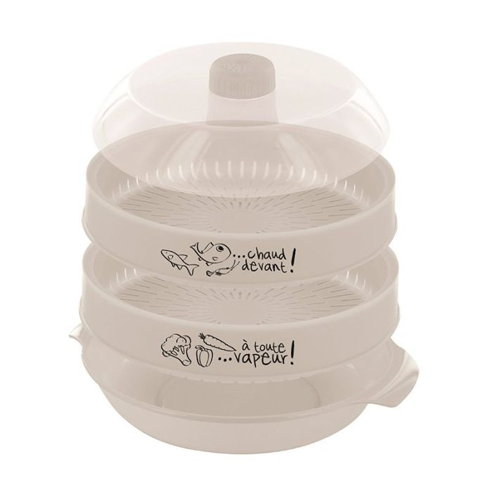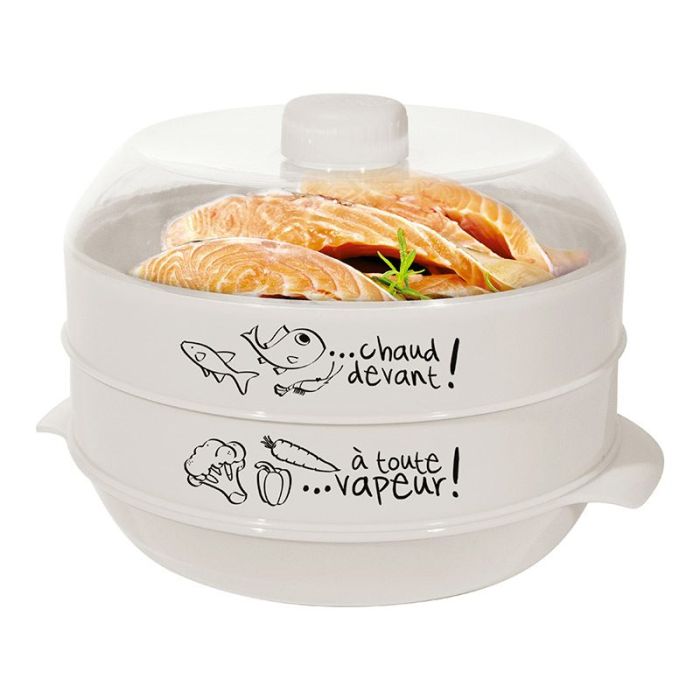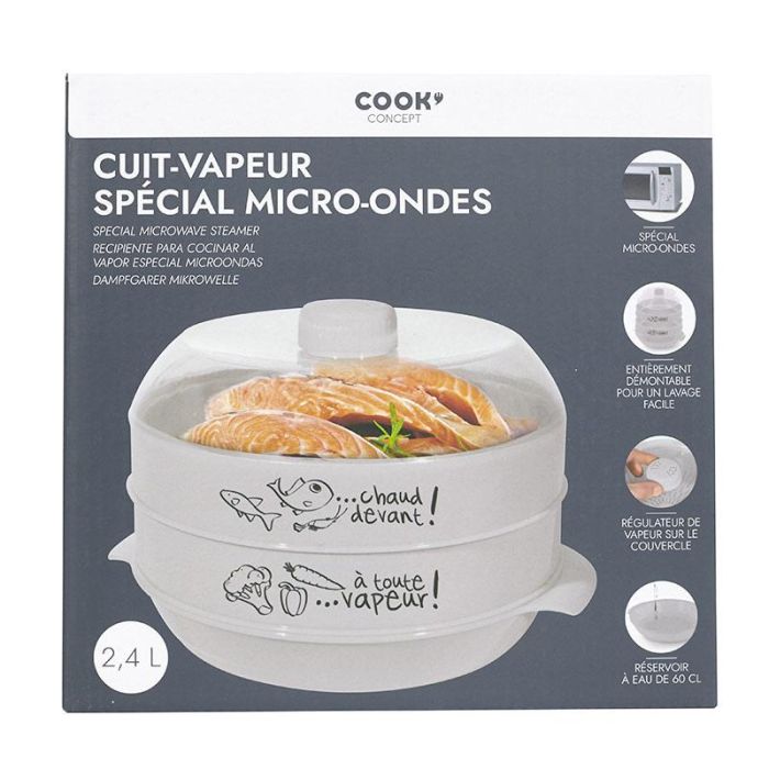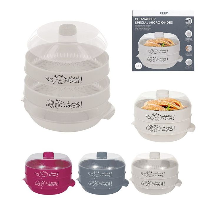 | Aanvullende kenmerken | Stoomkoker speciaal voor magnetron: Om snel uw groenten, fruit, vis of vlees te stomen en hun smaak te behouden. Een gezonde, snelle bereiding zonder vet.Stoomregelknop via het deksel. Waterreservoir 600 ml. Inhoud: 2,4 L |