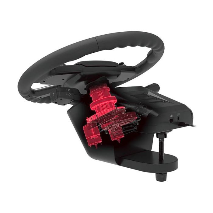 | Aanvullende kenmerken | -Volant op ware grootte van 40 cm met 1800 graden rotatie-Dubbele motor force feedback voor totale onderdompeling-H-versnellingsbak met 34 geïntegreerde knoppen-Inclusief Steam-downloadcodes voor “Euro Truck Simulator 2" en "American Truck Simulator"-Pas de bedieningselementen en invoergevoeligheid aan via de begeleidende app |