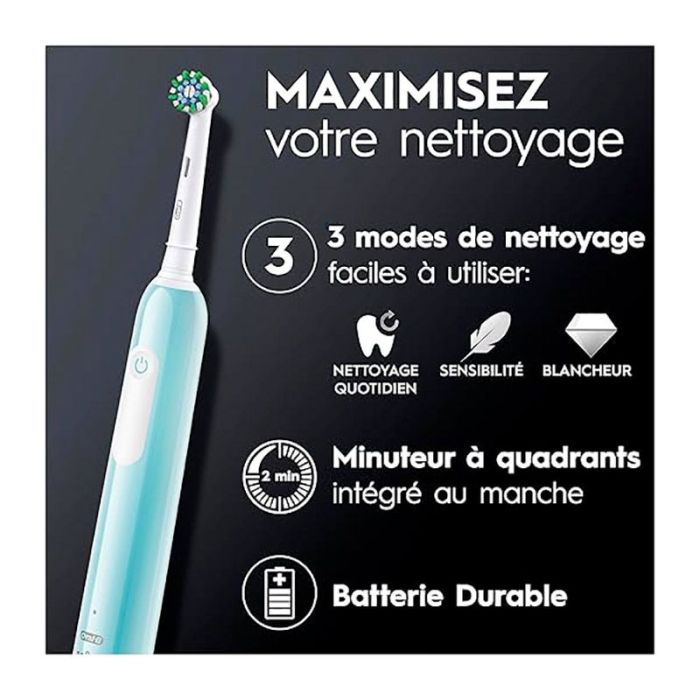 | Aanvullende kenmerken | ELEKTRISCHE TANDENBORSTEL ORAL-B PRO 1 Series 3D Reinigingstechnologie: Combineert oscillerende, roterende en pulserende bewegingen om tot 100% meer tandplak te verwijderen dan een handtandenborstel. 360° Drukcontrole: Beschermt gevoelige tandvlees met een verlicht ring die rood oplicht, verlaagt de poetsnelheid en stopt de pulsaties bij te hoge druk. 3 Gepersonaliseerde Poetsstanden: Reinheid (Daily Clean): Voor een klassieke dagelijkse reiniging. Zachtheid (Sensitive): Voor een zachte reiniging van gevoelige zones. Witheid (Whitening): Voor het verwijderen van oppervlakkige vlekken en het polijsten van tanden. Ingebouwde Professionele Timer: Geeft elke 30 seconden een signaal om van poetsszone te wisselen en trilt na 2 minuten, de aanbevolen duur door tandartsen. Lange Batterijduur: Lithium-ion batterij met tot 2 weken autonomie (ongeveer 60 minuten gebruik) na één volledige lading. Design en Ergonomie: Waterdichte handgreep met antisliplaag (structuur met nopjes aan de achterkant) voor een veilige grip, zelfs onder de douche. Lichtindicatoren: Inclusief batterijlaadindicator en laag batterijniveau indicator onderaan het handvat. Compatibiliteit: Compatibel met een breed scala aan Oral-B opzetborstels (CrossAction, 3D White, Sensi UltraThin, Precision Clean). |