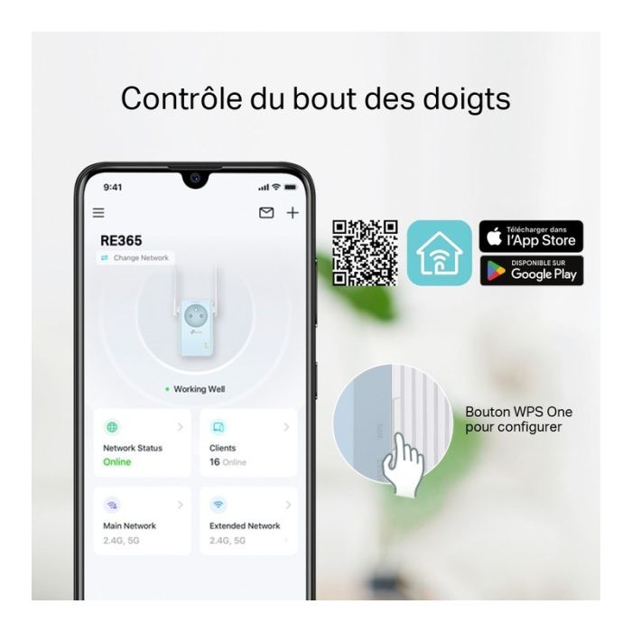 | Aanvullende kenmerken | Houd uw hele huis verbonden dankzij een krachtige WiFi-versterker met een gecombineerde snelheid tot 1,2 Gbit/s Het geïntegreerde stopcontact zorgt ervoor dat er geen stopcontact verloren gaat Het slimme signaallampje helpt u de beste plek te vinden voor een optimale Wi-Fi-dekking door de signaalsterkte weer te geven Werkt met elke Wi-Fi-router of draadloos toegangspunt Een WiFi-verlengoplossing die geschikt is voor gezinnen Moe van WiFi-loze zones in uw huis? De WiFi-repeater RE365 maakt draadloos verbinding met uw WiFi-router of internetbox en versterkt en breidt het signaal uit tot in uw huis. Met snelheden tot 300 Mbps op 2,4 GHz en 867 Mbps op 5 GHz, verandert u zones zonder netwerk in krachtige en snelle WiFi in elke kamer. Slim signaalindicator Het slimme lampje helpt u de juiste plek te vinden voor het beste bereik, en een intuïtieve webinterface helpt u deze in slechts één minuut te configureren. Functionele app voor controle binnen handbereik Download onze nieuwe Tether-app om uw netwerk te beheren vanaf elke Android- of iOS-smartphone, zodat u de voeding, toegang en zelfs de LED-verlichting kunt regelen. Stel indien nodig een andere netwerknaam en wachtwoord in. WPS-knop voor eenvoudige configuratie |